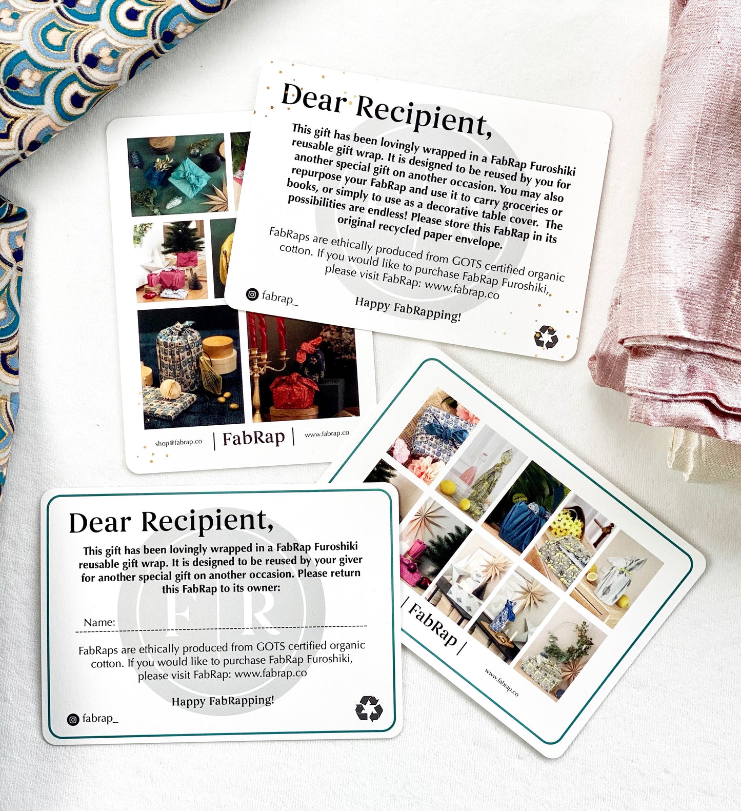 Each FabRap™ comes in a beautifully illustrated envelope made from recycled paper, perfect for storing your wrap safely between uses. We also include thoughtful notecards to let your recipient know whether the FabRap™ is theirs to keep or return—supporting a more sustainable and circular approach to gifting.